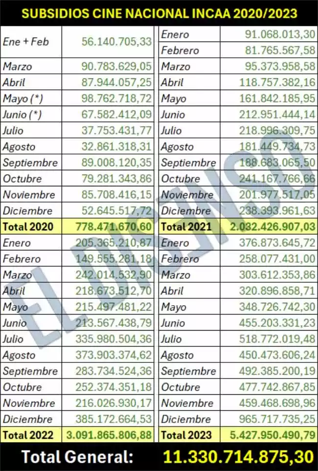 Durante el periodo comprendido entre enero de 2020 y diciembre de 2023, abarcando todo el gobierno de Alberto Fernández, el INCAA otorgó subsidios a producciones cinematográficas argentinas por un total de $11.330 millones.