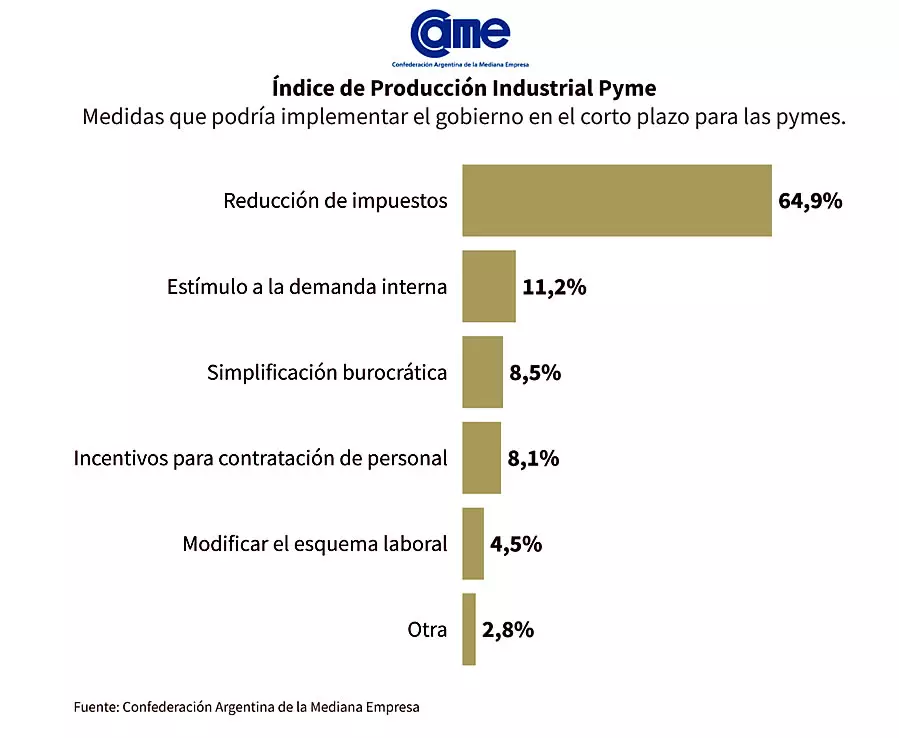 Las pymes mantuvieron su postura y nuevamente indicaron que la principal medida que debería implementarse en el corto plazo es la reducción de impuestos, tanto nacionales, como provinciales y municipales. Ese reclamo acaparó el 64,9% de las respuestas (3,1 puntos porcentuales por encima de noviembre). El segundo lugar lo mantuvo el estímulo a la demanda interna con el 11,2% de respuestas.