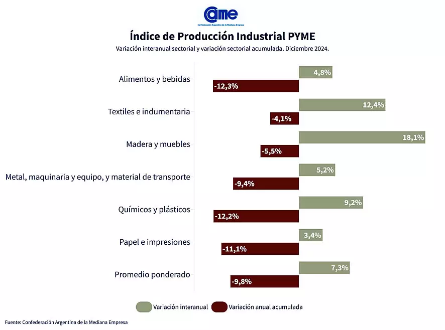 La actividad manufacturera de las pymes creció 7,3% interanual en diciembre -en la misma fecha de 2023 el descenso fue del 26,9%- y cerró el 2024 con una caída acumulada del 9,8% respecto al 2023. Cabe destacar que en el último mes del año todos los sectores relevados presentaron variaciones positivas en sus comparaciones interanuales.