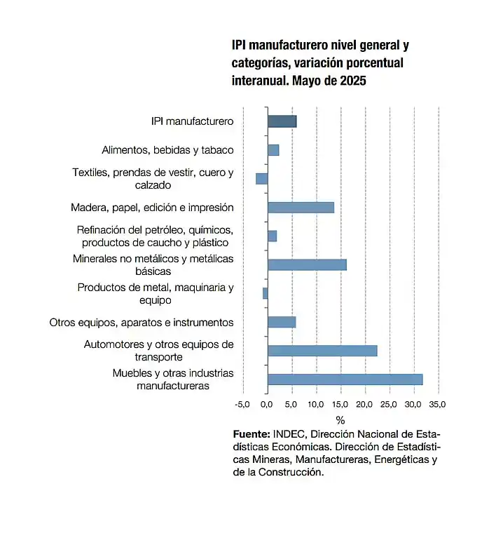 Pese al crecimiento general, algunos sectores mostraron caídas. El rubro “Otros equipos, aparatos e instrumentos” registró una baja mensual del 3,4%, mientras que “Productos de metal, maquinaria y equipo” cayó un 1,1% interanual, lo que refleja ciertos desequilibrios aún presentes en la estructura productiva.