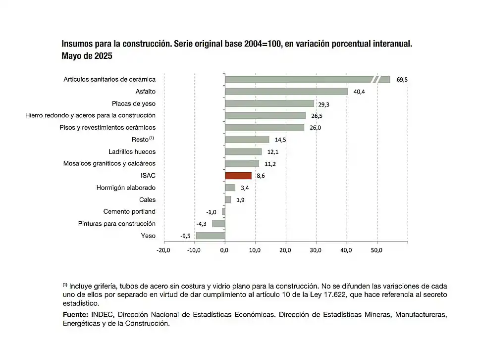En paralelo a la recuperación industrial, el sector de la construcción mostró señales mixtas. En mayo, la actividad cayó un 2,2% respecto de abril, pero creció un 8,6% en comparación con mayo de 2024. En el acumulado de los primeros cinco meses, la mejora alcanzó el 10%. Este avance se vio favorecido por la reactivación de obras privadas y la demanda sostenida de insumos como cemento, cerámica y materiales prefabricados.