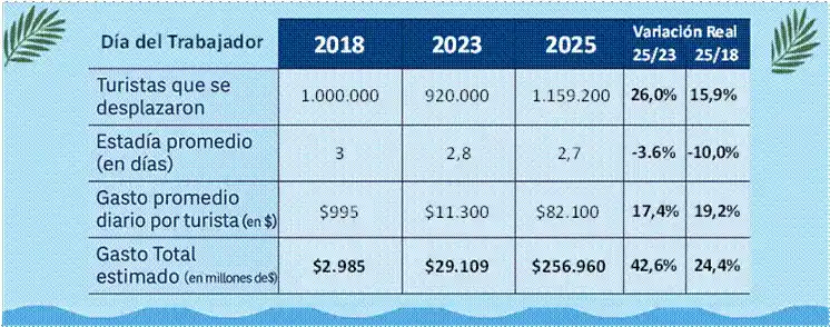 - El feriado por el Día del Trabajador mostró un desempeño muy superior al de 2023, porque ese año el fin de semana largo tuvo sólo 3 días. En comparación con ese período, el movimiento turístico creció 26% y el gasto total estimado se incrementó 42,6% en términos reales.